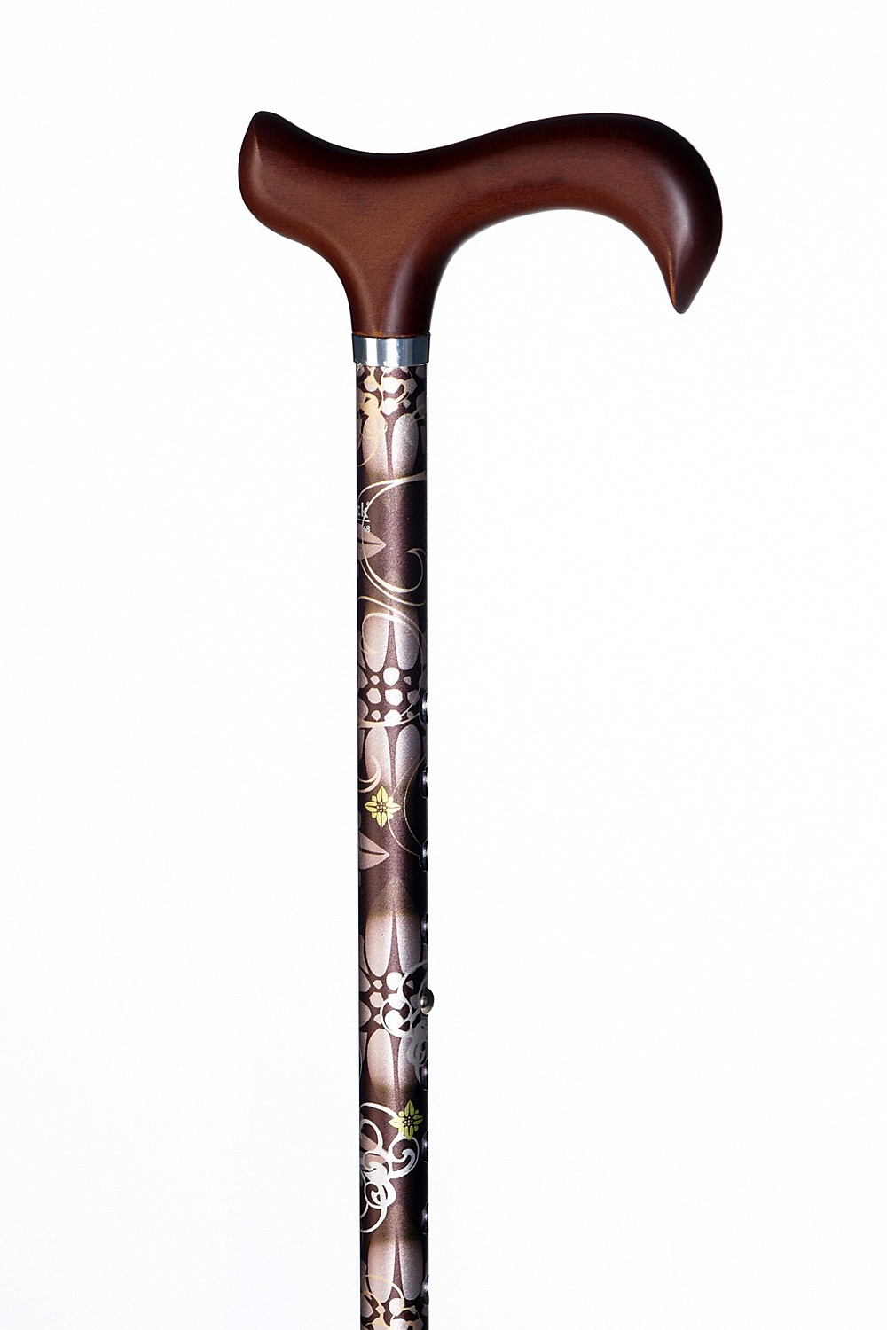 This slim walking stick is made of light metal and has got an ornament satin finsh. The elegant brown coloured derby grip is made of hard wood. It's height adjustable from 75 to 100 cm. Equipped with a rubber buffer.