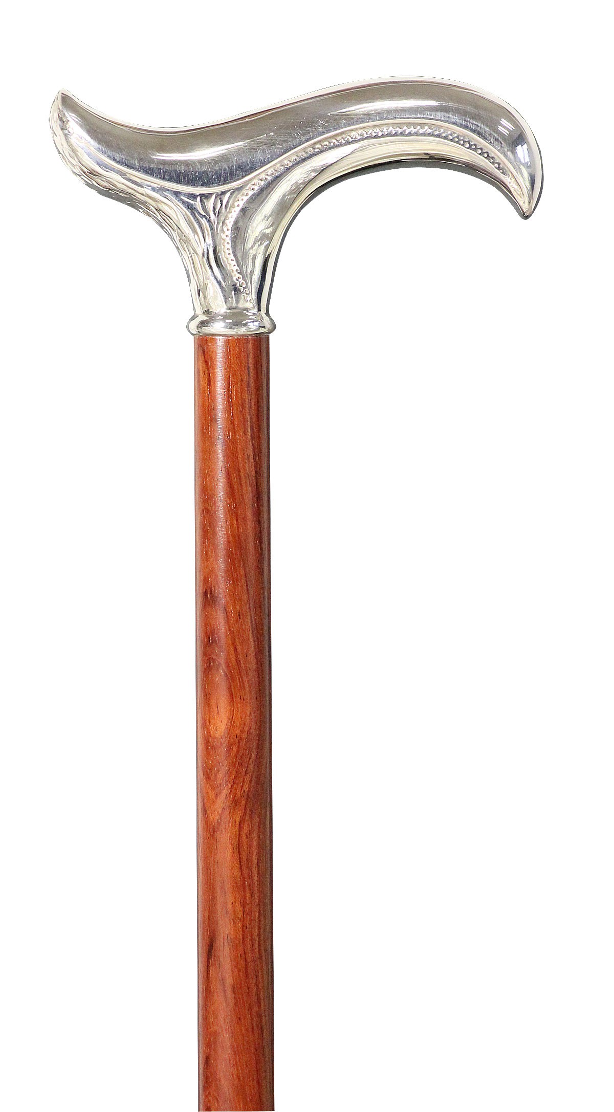 The silver plated and simply adorned derbygrip has got a very noble fine gently curved form. The grip fits on a shaft of lively red-brown grained bubinga wood (kind of african oak). Equipped with an elegant rubber buffer.