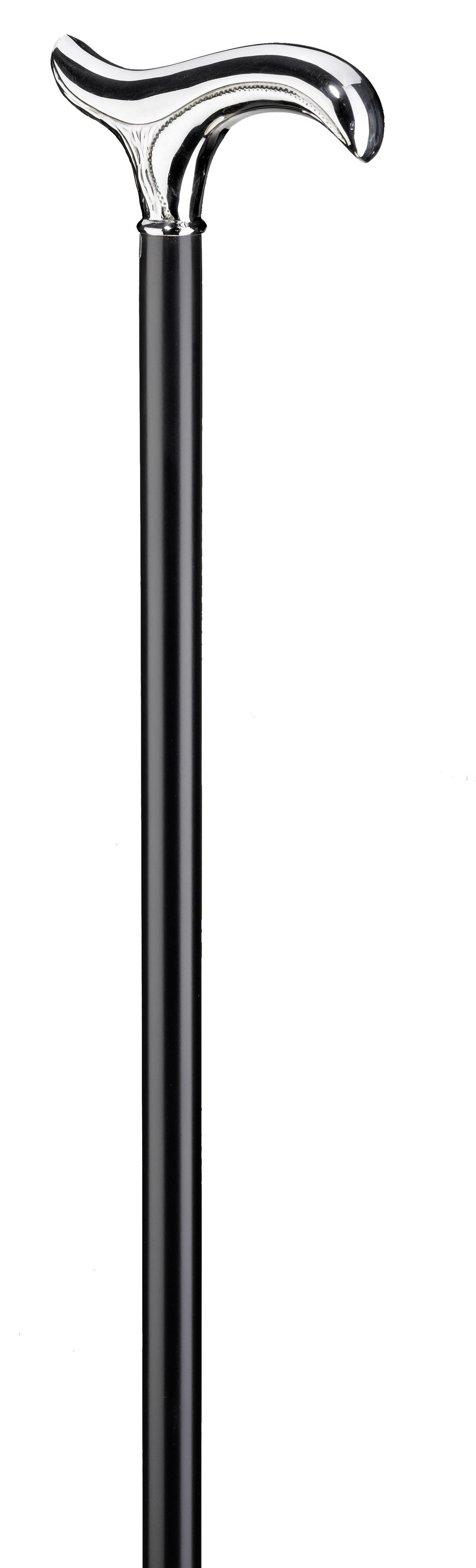 Der feinversilberte hochwertige und leicht ziselierte Derbygriff besticht durch die fein geschwungene leicht spitz zulaufende Form. Aufgesetzt ist der Griff auf einen Schuss aus schwarz lackiertem Buchenholz. Als Abschluss hat der Stock einen schlanken Gummipuffer.